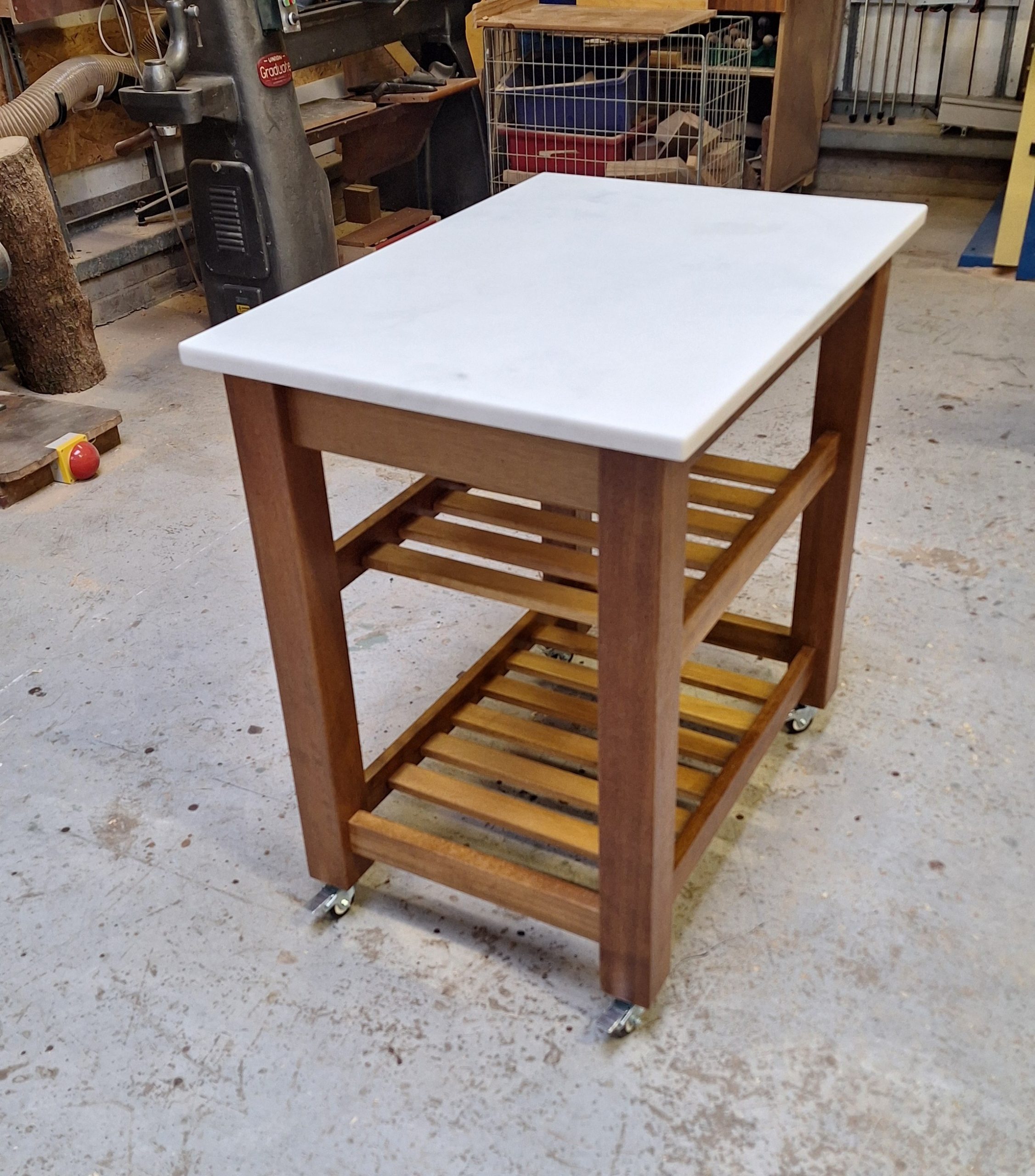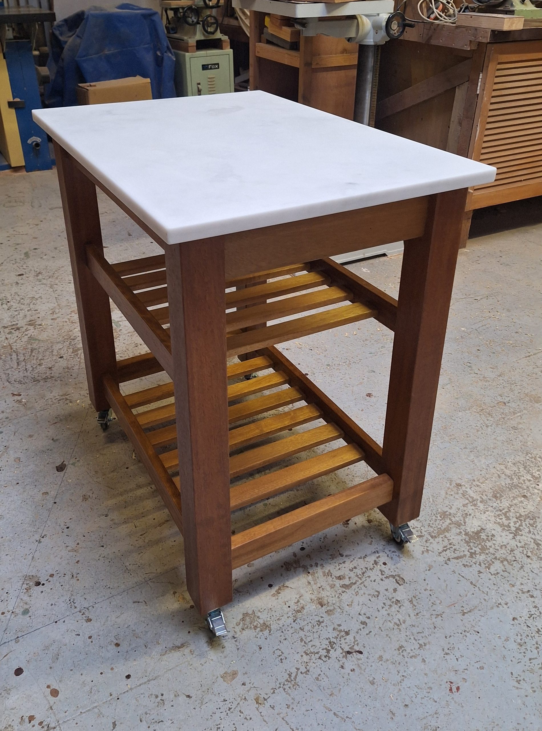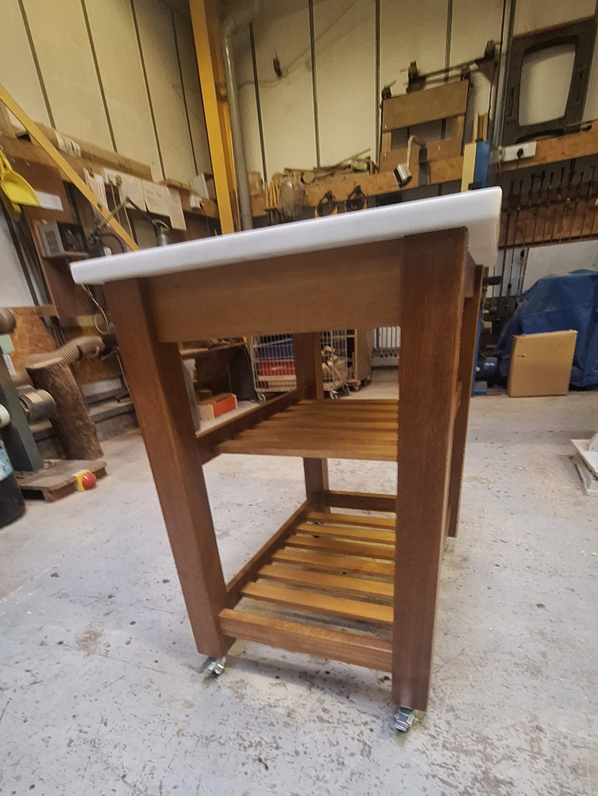 A few months ago I was approached by one of our members regarding making a sort of butchers block table on wheels. The ones on-line varied tremendously in quality and price; many being very overpriced! After some discussion we decided to make the top out of an offcut of a composite marble type material. This would make the top much more hygienic as the end grain of timber would be diffcult to keep keep clean. Fortunately we had a piece of this donated by another member when he had a new kitchen fitted not so long ago. For the frame we had some Iroko on site, left over from a variety of other projects. John Ferrie