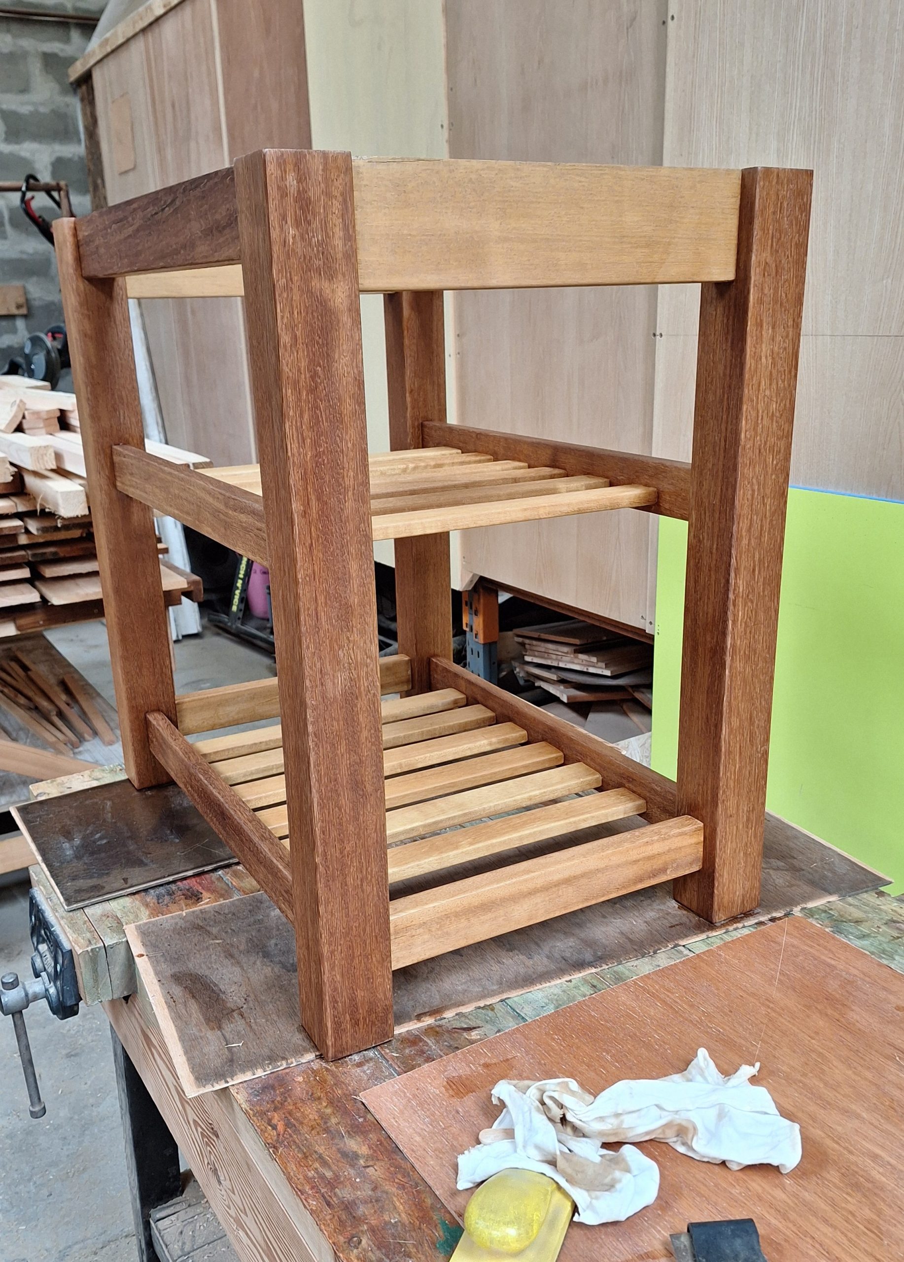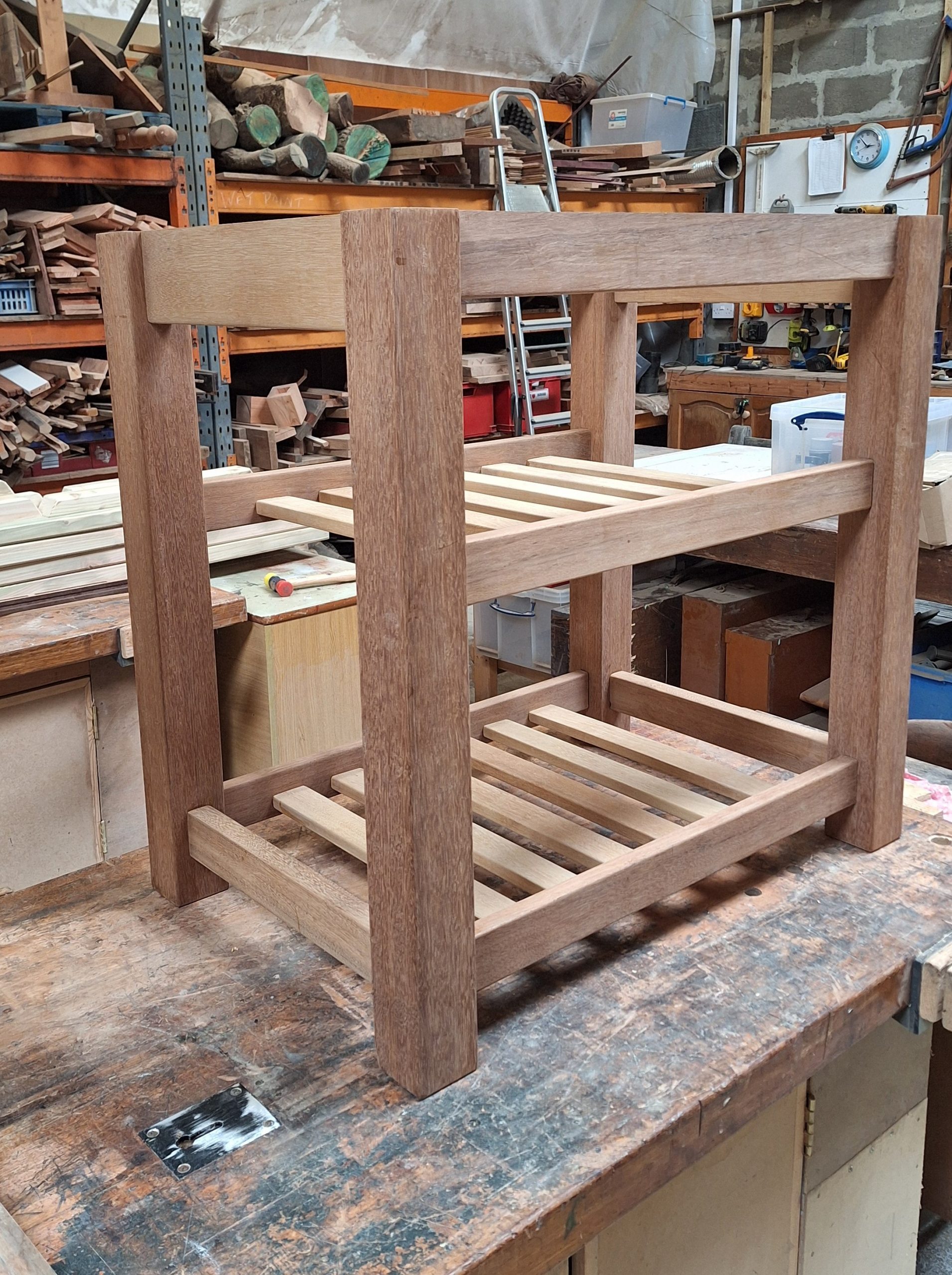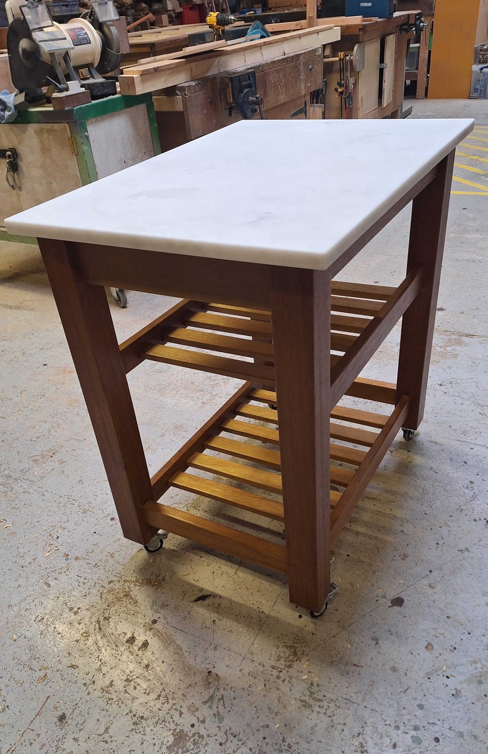 A few months ago I was approached by one of our members regarding making a sort of butchers block table on wheels. The ones on-line varied tremendously in quality and price; many being very overpriced! After some discussion we decided to make the top out of an offcut of a composite marble type material. This would make the top much more hygienic as the end grain of timber would be diffcult to keep keep clean. Fortunately we had a piece of this donated by another member when he had a new kitchen fitted not so long ago. For the frame we had some Iroko on site, left over from a variety of other projects. John Ferrie